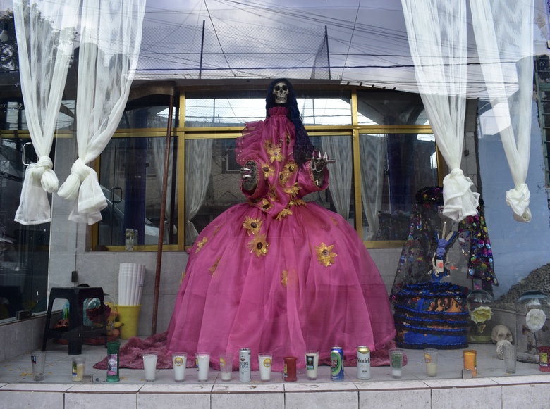 10 de abril de 2026, colonia Nuevo Valle de Aragón, Ecatepec, Estado de México. Un altar dedicado a la Santa Muerte se erige sobre la calle Valle de Gaviota. La región presenta altos índices de marginación y criminalidad; la adoración a la Niña Blanca es habitual entre comunidades que buscan protección y prosperidad. ©Aram Yoav Sánchez Ledezma