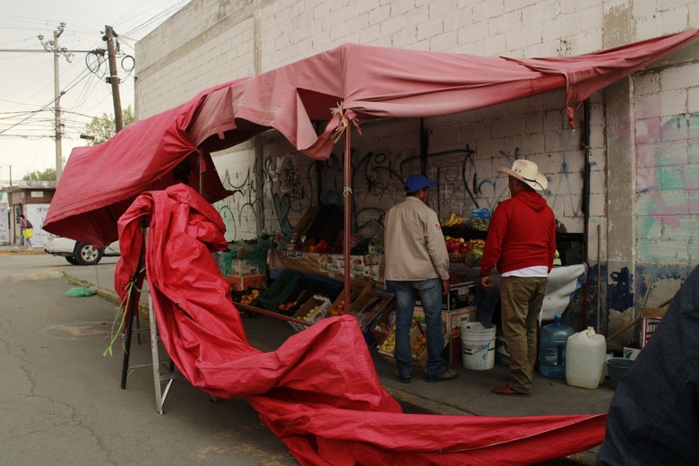 Comerciantes recogen sus puestos al primer signo de lluvia, aprendizaje obligado tras años de ver cómo el agua se lleva todo a su paso. ©Naomi Shantee León Reyes