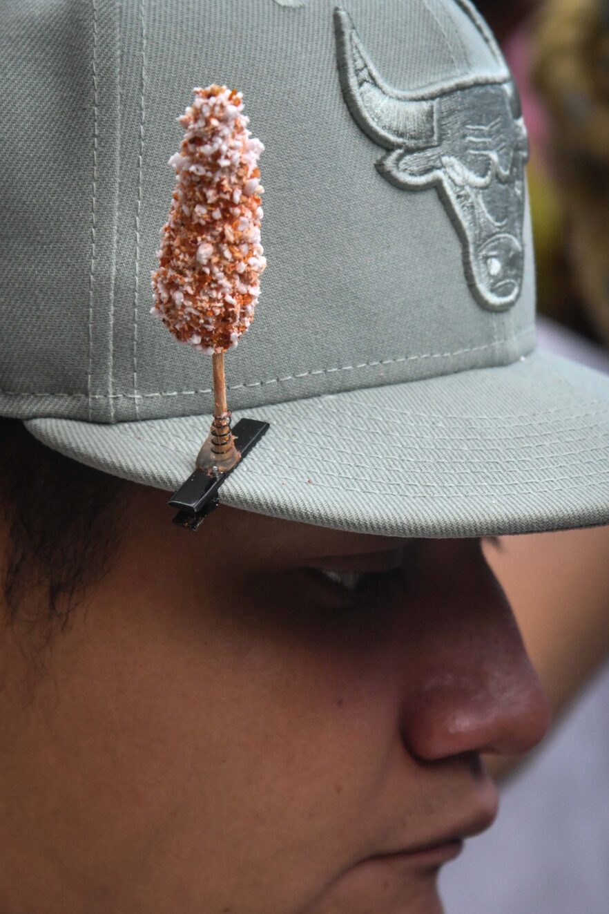 CIUDAD DE MÉXICO, 23SEPTIEMBRE2025.- Pinzas con réplicas en miniatura de elote se vendieron durante el 68 aniversario del tradicional Mercado de Jamaica.
