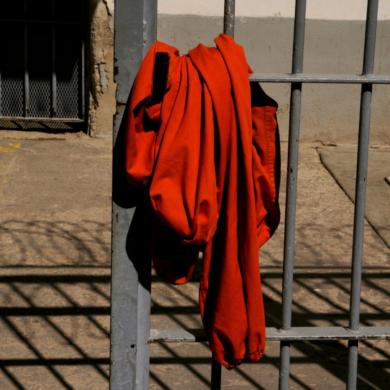 Un overol de color naranja intenso, utilizado para los internos cuando deben ser trasladados a los juzgados, se encuentra a la espera de un reo cuyo caso apenas inicia y que tendrá diversas audiencias para su juicio.