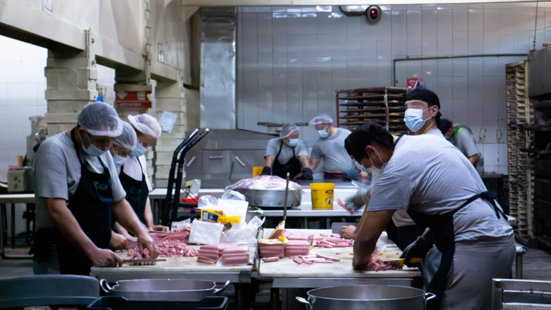 Existe una regla de disciplina dictada por los custodios: cada vez que un grupo de visitantes se cruza con algún interno en sus actividades cotidianas, como la persona en la imagen que trasladaba platos para la comida, éste debe voltear hacia la pared mientras las personas pasan por el lugar.