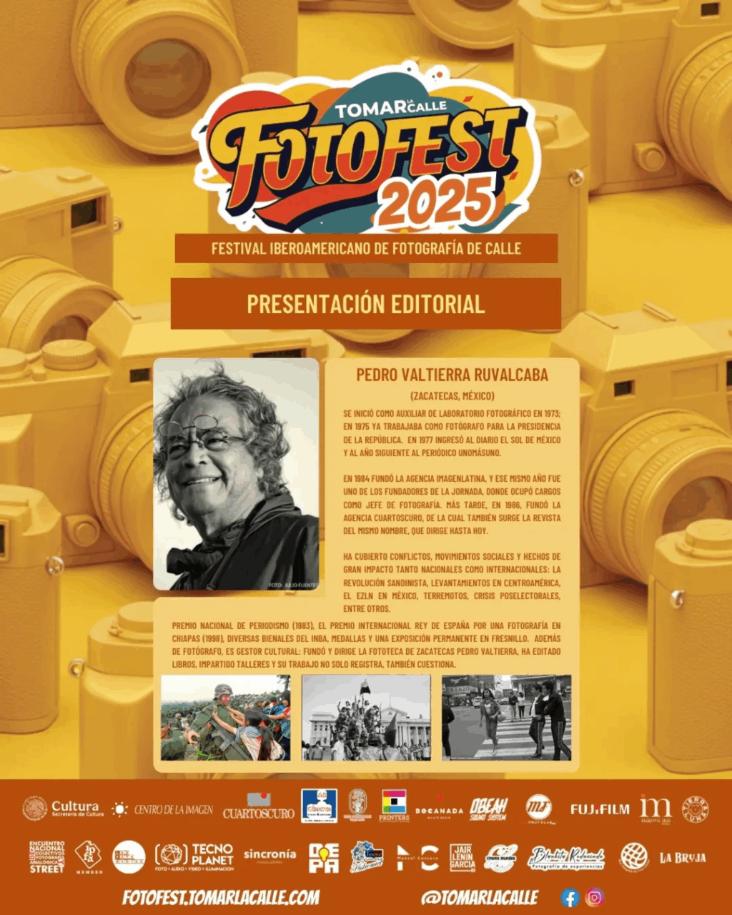 Pedro Valtierra, fotógrafo con cinco décadas de trayectoria y fundador de la agencia y revista Cuartoscuro, presentará su libro “Sin miedo a la luz” y el número 186 de la revista Cuartoscuro durante el Tomar la Calle FotoFest 2025. La cita será el sábado 27 de septiembre a las 16:00 horas en el Auditorio Biblioteca Carlos Fuentes, en Xalapa, Veracruz. La entrada es libre.