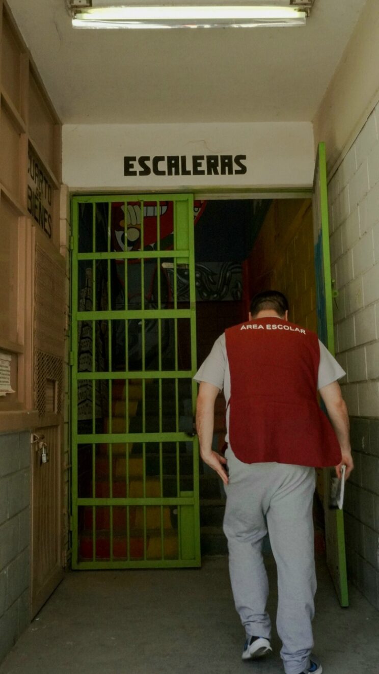 Un interno, supervisor del área escolar, se dirige a su zona de trabajo para apoyar a los internos que deciden tomar un taller educativo, ya sea de educación básica para adultos, alfabetización digital o manualidades.