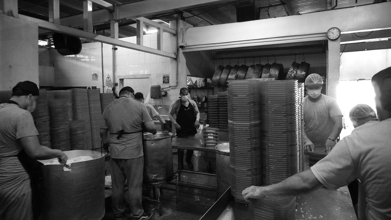 La comida empieza a prepararse desde la mañana. El trabajo se realiza en equipos, como este, responsable de servir una de las porciones de comida para cada uno de los internos. Una vez terminada esta etapa, los platos pasan a otra área donde los completan con el resto de los alimentos y guarniciones.