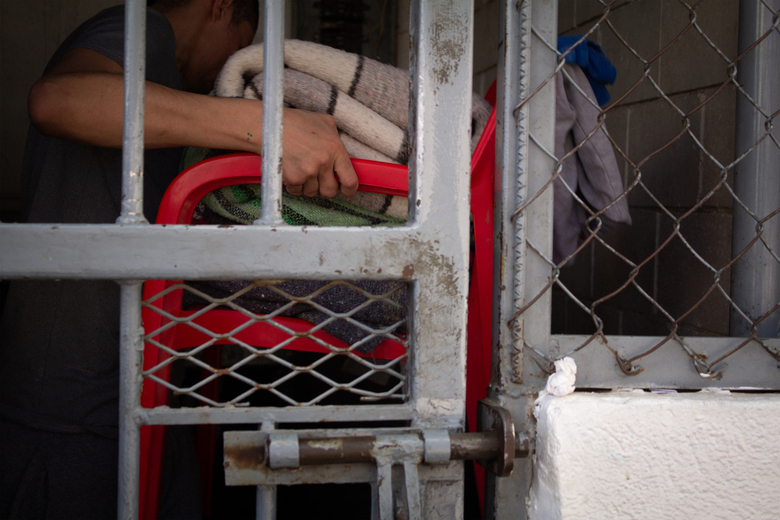 Un interno de la cárcel de Mexicali prepara unos cobertores antes de introducirlos al equipo de lavado. Un equipo designado entre los propios reos se encarga del lavado. Esta actividad se lleva a cabo en espacios pequeños y cerrados.